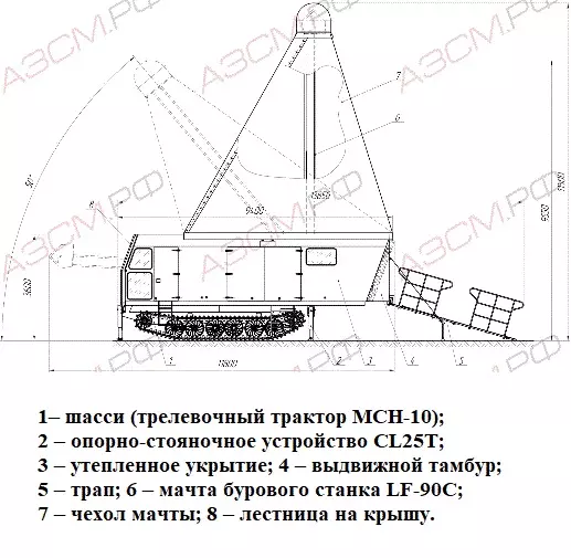 Самоходная буровая машина МСН-10-ТСБУ-200М предназначена для бурения вертикальных и наклонных геологоразведочных скважин на твердые полезные ископаемые с отбором керна съемным керноприемником. Машина укомплектована буровым станком Boart Longyear LF-90С. По желанию заказчика на машину может быть установлен другой зарубежный или отечественный буровой станок с подходящими массо-габаритными характеристиками.